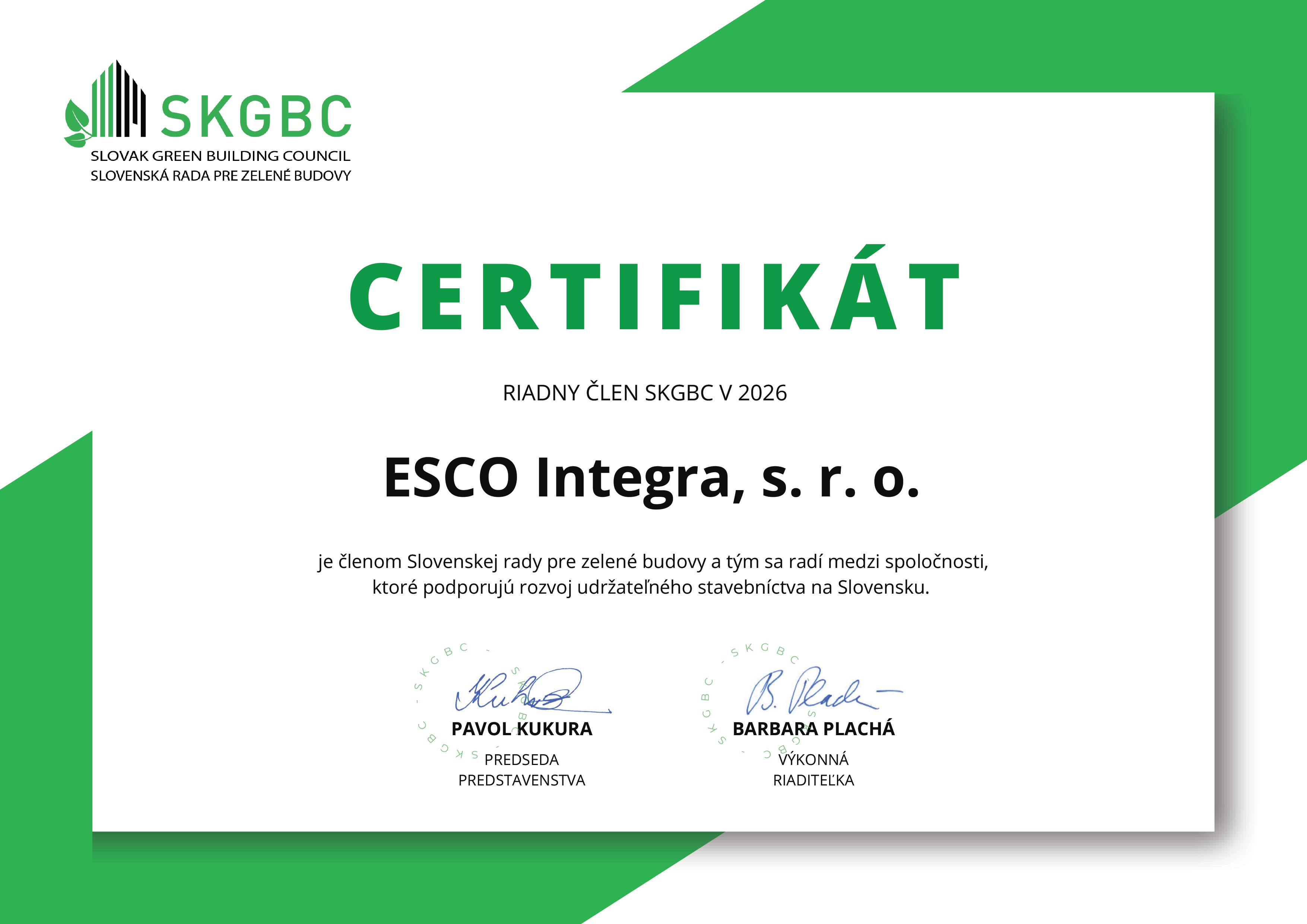 Spoločnosť ESCO Integra je od roku 2026 novým členom združenia Slovenská rada pre zelené budovy (SKGBC). Naše členstvo nadväzuje na doterajšie pôsobenie spoločnosti ESCO Slovensko, ktorá bol súčasťou tohto združenia v predchádzajúcich rokoch. Vstup ESCO Integra do SKGBC potvrdzuje náš dlhodobý záväzok prinášať udržateľné a inovatívne riešenia v oblasti energetických služieb, efektívneho využívania energie a ochrany životného prostredia.